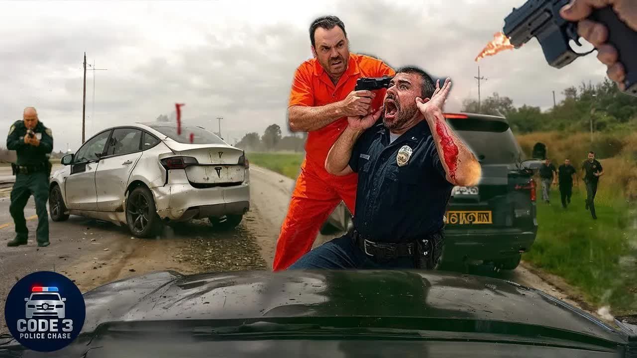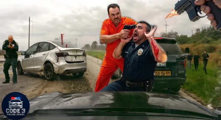 One second can change everything. A police chase that began with screeching tires has spiraled into a life-or-death standoff on a desolate road. A desperate prisoner, fresh out of a wrecked car, clings to survival by holding an officer hostage. Gunfire erupts, backup rushes in, and every breath counts. This isn’t just a chase—it’s the thin line between chaos and control, between law and lawlessness.